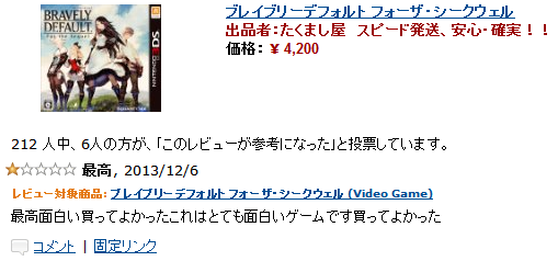 ブレイブリーデフォルト フォーザ・シークウェル 価格: ¥ 4,081 190 人中、6人の方が、 「このレビューが参考になった」と投票しています。 5つ星のうち 1.0 最高, 2013/12/6 レビュー対象商品 ブレイブリーデフォルト フォーザ・シークウェル (Video Game) 最高面白い買ってよかった これはとても面白いゲームです買ってよかった なにゆえ☆1をつけた ※参考