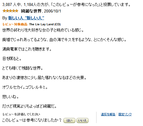 世界の終わりを大好きな女の子と眺めている感じ。 廃墟でじゃれあってるような、 血の海でキスをするような、とにかくそんな感じ。 満員電車ではこれを聴きます。 目を瞑ると。 とても暗くて残酷な世界。 あまりの凄惨さに少し居た堪れなくなるほどの光景。 オワルセカイ。コワレルキミ。 悲しいね。 だけど現実よりもよっぽど綺麗だ。 ※参考 引用元:http://www.amazon.co.jp/review/R2X3EH2Q7LX543
