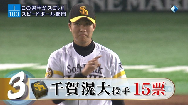 平野はもっと人気出てほしいなー 3位 千賀滉大 15票山本昌「短い回でこんなボール投げ続けられたらそうは打てない」炭谷「キレもあるし伸びてくる」坂本「ドーンと来る感じ」27試合連続無失点のインパクトは抜群で、中日巨人から4票を集めた