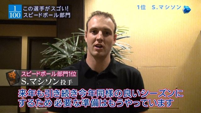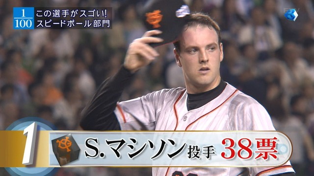 牛丼お兄さんとラジコンおじさん 1位 S.マシソン 38票新井兄「角度があって球が速い」菊池「最初打席に立った時は怖ぇ~と思いました」廣瀬「漫画で出てきそうな字が書いてありそう ”ゴォ~”って」モーガン、杉内「マシソン」菅野「今まで見た中で一番速い」西村「うらやましい」由伸「味方でよかった」