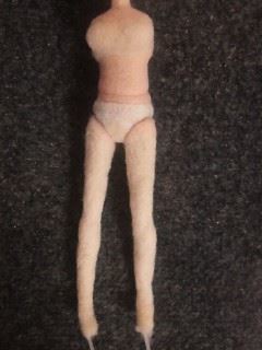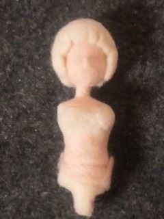 筒状に縫った白フェルトを頭からかぶせ、 針で刺してなじませます スカートがハイウエストのためにトップスと重なってしまい、 幼児体型っぽくなっています