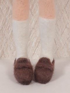 靴を作ります こげ茶の羊毛を足の裏に刺します これが靴底になります