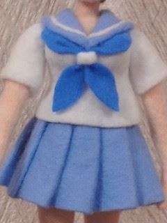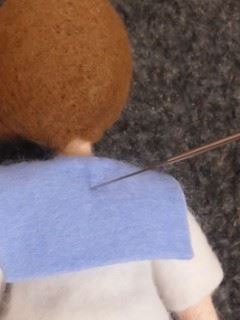 白いフェルトをひっかいた繊維を撚って刺し、襟に線を入れます 濃い水色のフェルトでスカーフをつけてセーラー服完成