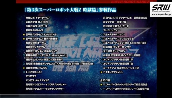 0発売予定、クロスセーブ対応 2部構成のシリーズ最大級の参戦作品数、参戦作品数は32 高解像度の戦闘アニメで、動き、カットイン、エフェクトを細かく書き込んでいる 無敵ロボ トライダーG7、鉄人28号、六神合体ゴッドマーズ、装甲騎兵ボトムズ3作品、超時空世紀オーガスZガンダム、逆襲のシャア、ガンダムW Endless Waltzガンダム00 A wakening of the Trailblazer、ガンダムユニコーン、トップをねらえ! 、マクロス7、ダイナマイト劇場版マクロスFイツワリノウタヒメ、サヨナラノツバサ、 真ゲッターロボ 世界最後の日、真マジンガー衝撃!Z編地球防衛企業ダイ・ガード 、THE ビッグオー、フルメタル・パニック3作品、獣装機攻ダンクーガ ノヴァ 劇場版天元突破グレンラガン、ヱヴァンゲリヲン新劇場版序・破、コードギアス、アクエリオンEVOL とりま参戦作品